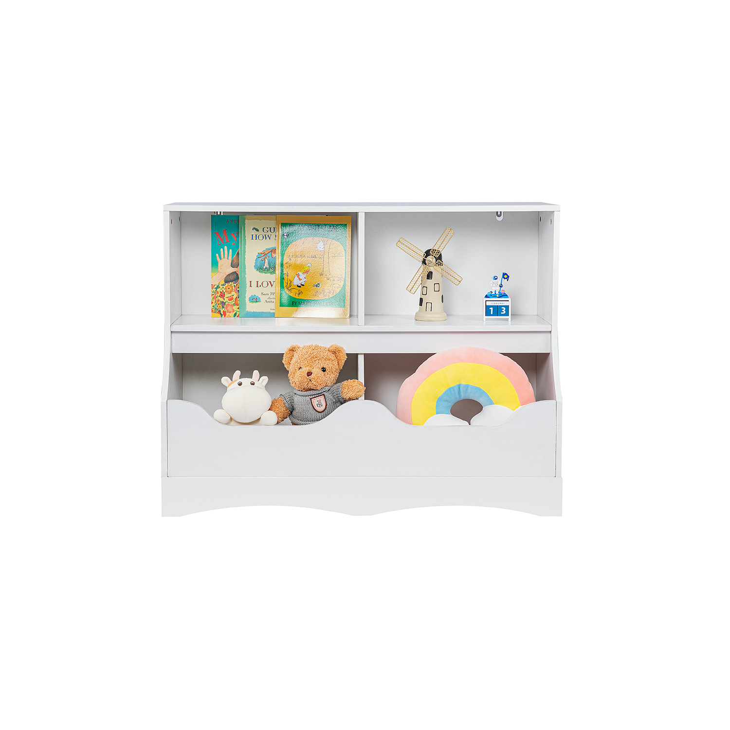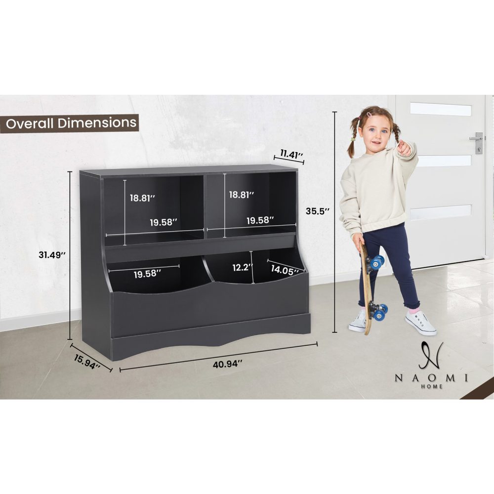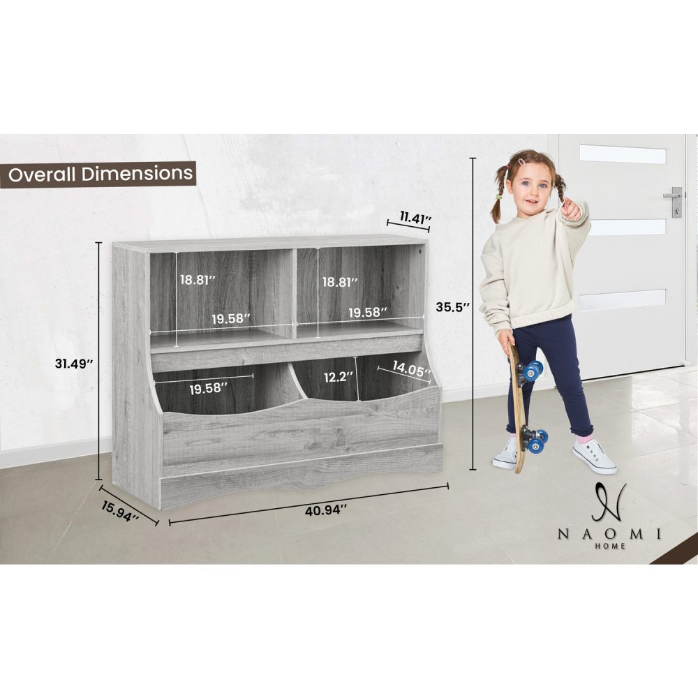 The Nancy Kids Toy Storage with Bookshelves features a child-friendly design, built at the perfect height for kids to easily access their toys and books. It includes two spacious bookshelves that can accommodate books of all sizes, from large picture books to smaller paperbacks. The two large cubbies provide ample space for storing toys, games, art supplies, and other items, helping to keep the room tidy and organized.